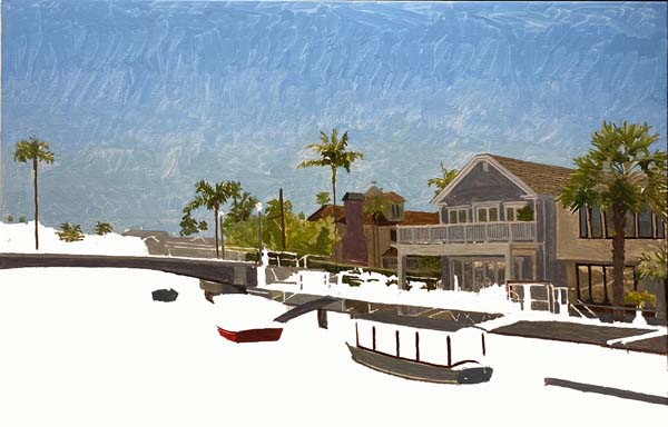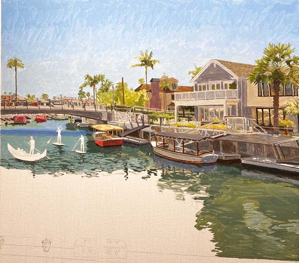 The Naples canal scene has been painted with it's first layer except for the Gondolier and the two paddleboarders. The large white water area in the lower left has been left bare until I draw MaryBeth on the window sill.
