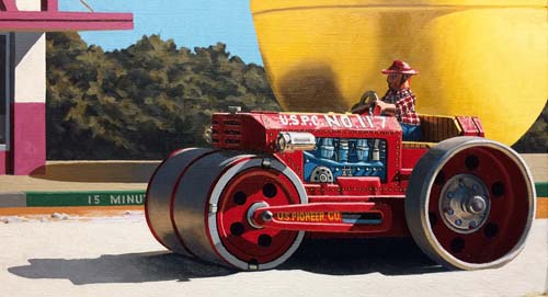 ![]() I'm always looking for a unique tin toy that sparks my imagination. When I saw this steam roller on eBay, I was all over it. I immediately thought of the roller in the street, rolling out cookie dough. This commercial process of larger than household dough rolling told me that I needed a building for a bakery. ![]() I went into my boxes of 35mm slides from the past and came up with this liquor store on the outskirts of Nashville, Tennessee. I photographed this building while I was researching the Nashville area for information to paint a commissioned oil painting for Houston's Restaurants. ![]() This vintage wooden rolling pin will help decorate the bakery building. ![]() Since I was thinking of sugar cookies, I purchased these vintage stars and moon cookie cutters. I visualize them hanging on a wall or the sky, casting some long interesting shadows. ![]() What goes better with cookies than milk? I had this old milk bottle which I stuck a vintage Borden's milk label on its side. With Carol's help, I rolled out some dough and made some cookies, applying frosting on a few of them. ![]() Here's my sketch of "Milk And Cookies." The baker has come outside to direct traffic. ![]() As with all my paintings, I hand stretch the finest Belgium portrait linen onto heavy duty stretcher bars. I've drawn out the design of the painting onto the canvas with a #2 pencil. To begin the painting, I've painted in the sky with a mixture of thalo blue and cadmium yellow, thinned with turpentine. ![]() Next, I've blocked in the cast shadows from the aluminum cookie cutters that are hanging from nails on the sky. ![]() I've mixed up a green from thalo green, cadmium yellow and burnt sienna. Black was added to the very dark areas and white was added to the light green to give the highlights. ![]() The handle on the right side of the rolling pin is treated the same way, with a little more Permalba white added to show where the sun reflects off of the enameled green handles. ![]() Here is the entire rolling pin. I painted the body of the pin with a mixture of burnt umber, burnt sienna and French ultramarine blue. I added cadmium yellow to the shaded area on the lower area of the rolling pin and added white to the sun struck upper area. ![]() I've painted the simple crude supports of the rolling pin with a very dark mixture of French ultramarine blue, burnt umber and ivory black. They aren't exactly the same size, the right being larger. I may adjust that later or keep it...we'll see. ![]() Since I had some green paint mixed, I added some more burnt sienna and yellow and painted the upper windows of the building. ![]() I'm staying up in the sky and rendering the cookie cutters. Here is the moon. ![]() These old cutters are very thin aluminum. The little curved handles have lots of bends and curves in them. ![]() Here are all four cutters. The nail represents the cutter that will be sitting on the street with the cookies and cookie dough. ![]() I've chosen a pinkish hue for the bakery sign and building trim. I can't paint all of the pink areas just yet. I need to draw in my baker first. My friend, Toby, will be posing soon. ![]() The bushes/trees in the background are roughed in. I may give them a little more detail later. ![]() This vintage bowl comes from a 4 bowl set. It not only helps me introduce a needed color into the setting, but it also gives me a chance to show the light passing through opaque glass. ![]() It's time to paint the steam roller. It's a very detailed tin toy and will require a steady hand. I've started by putting in the darkest hue. ![]() I've applied the reds, a mixture of cadmium red and alizaron crimson, with white and black added to lighten and darken. ![]() Today was model posing day. After some cloudy days with a little rain, today was perfect! The sun was shining and my good buddy and golf partner, Toby, stopped by to pose for "Milk And Cookies." Toby said that he had a baker in the family history. I know he is a master of bar-b-que and a cook (when he isn't working at his day job). So, posing as a baker not only fits him, but the baker's uniform fit him as well. Thanks, Toby! ![]() I've continued on with the steam roller, leaving only the 'tin' driver to complete. ![]() The steam roller driver, like most tin figures is made of two halves. The dark line you see running down the side of his face is the seam between the two halves. ![]() I'll move off the steam roller and move onto painting the baker, standing out in front of his store. ![]() Starting with his face, I'm using two 00 (double ought) sable brushes: one is a 00 round and the other is a 00 bright. As you can see, one slight move off the mark and the features change dramatically. I could just paint all my figures with some generic facial features, but I've always enjoyed documenting my friends, making every image unique. ![]() This close-up of my thumb, sitting on the canvas, gives a better idea of how small of an area I am working in. Toby's head is about 1/2" tall, about the size of my thumbnail. ![]() As we zoom in on the portrait, you can see that it looks like a larger portrait on rough canvas. I've applied the paint much thicker than I usually apply in the first layer so that I am able to see more of a final product with my efforts. ![]() The rest of the baker's uniform is treated as usual, with the oil pigment thinned out. ![]() The building is next, adding the shaded part of the building on the upper left and some of the architectural details on the facade. I've also begun to delineate some of the interior detail.